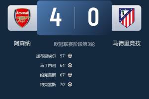 13分钟4球!阿森纳4-0横扫马竞取欧冠3连胜约克雷斯双响加布破门