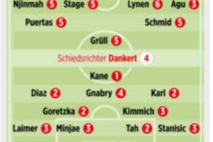 体育资讯2月15日讯 德甲第22轮比赛,拜仁客场3-0击败不莱梅,《图片报》对两队球员进行了评分。