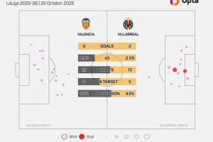 据Opta统计,比利亚雷亚尔51次在西甲比赛中对阵瓦伦西亚,战绩22胜11平18负,瓦伦西亚是西甲历史中黄潜战胜次数最多的球队,超过对阵赫塔费的取胜次数(21胜)。