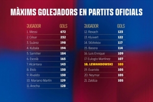 本周日的比赛同时达成了蒙锥克球场百球里程碑。此役前巴萨已在此打入99粒进球,孔德的破门成为蒙锥克球场第100球。莱万攻入第第101球,他以24球成为俱乐部在该球场的历史射手王,拉菲尼亚以15球位列次席。