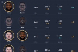 詹姆斯、东契奇同场时,净效率+1.9