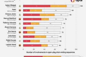 体育资讯11月12日讯 据Opta统计,姆巴佩本赛季联赛参与106次以射门终结的进攻,西甲球员中最多。