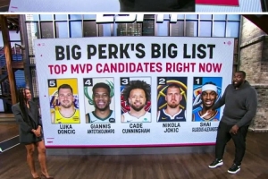 体育资讯11月15日讯 评论员帕金斯在节目中给到了自己的赛季至今的MVP名单前五球员。他把亚历山大排在了第一位,约基奇排在了第二位,康宁汉姆放在了第三位。