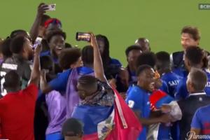 在比赛结束后,海地球员围在一起等待哥斯达黎加vs洪都拉斯的结果。比赛结束后,海地球员疯狂庆祝。