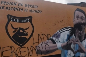 这幅壁画位于罗萨里奥北部的托里奥俱乐部,迪马利亚小时候曾在这里踢球。壁画的内容是迪马利亚在2022年世界杯决赛进球后的庆祝动作,旁边还有托里奥俱乐部的队徽。但本周有人用黑色喷漆破坏了壁画,并在一旁写着“小偷,雇佣兵”。