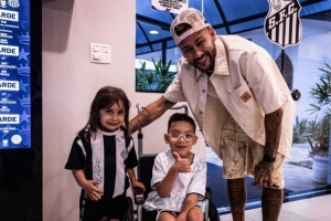 桑托斯小球迷莱维患有先天脊髓脊膜膨出症,这是一种罕见的疾病,莱维坚强地与病魔抗争,今日他受邀参观桑托斯训练中心,与球员们见面合影,并与自己的偶像内马尔互动,桑托斯社媒晒出相关照片。