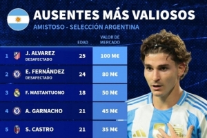 缺席本期阿根廷队球员身价排名: