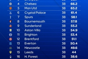 天空体育预测本赛季英超最终排名(积分为模拟10万次的平均值)