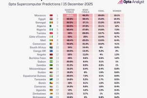 Opta超级计算机预测非洲杯夺冠概率: